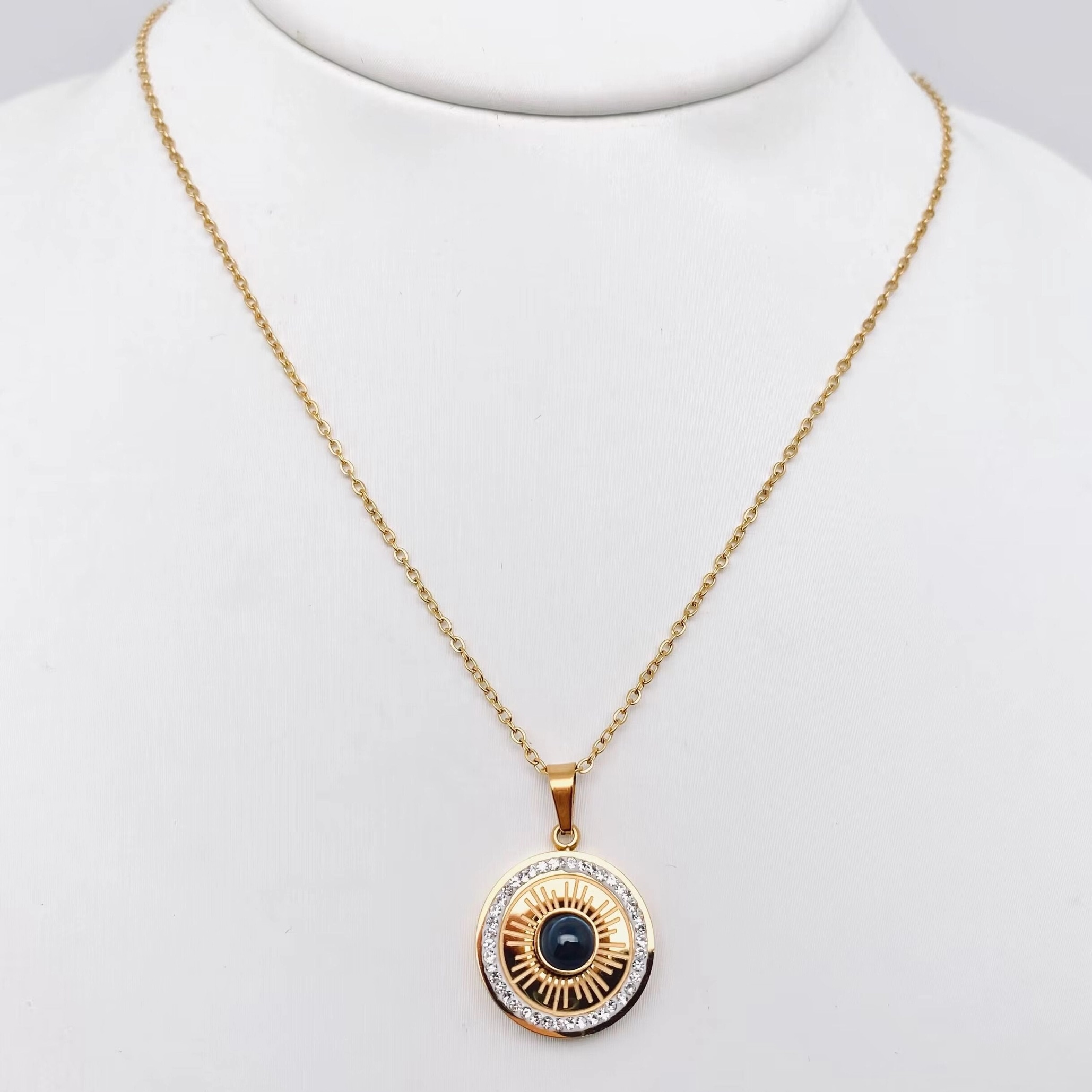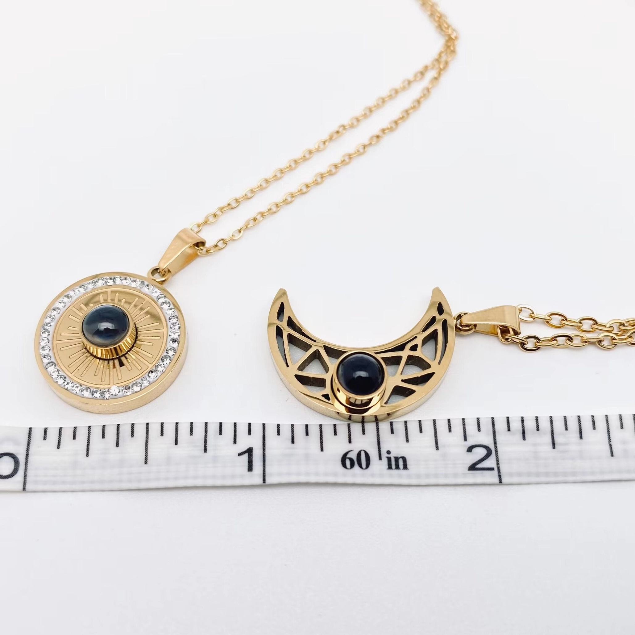 "I Love You" Projection Necklace with Sun and Moon Pendant in 100 Languages. This exquisite necklace features a unique pendant with a sun and moon design.