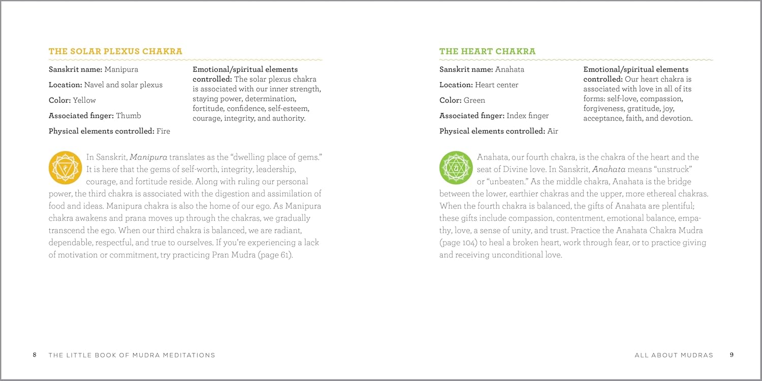 Quickly find the mudra meditation you need in this well-organized, color-coded guide.
