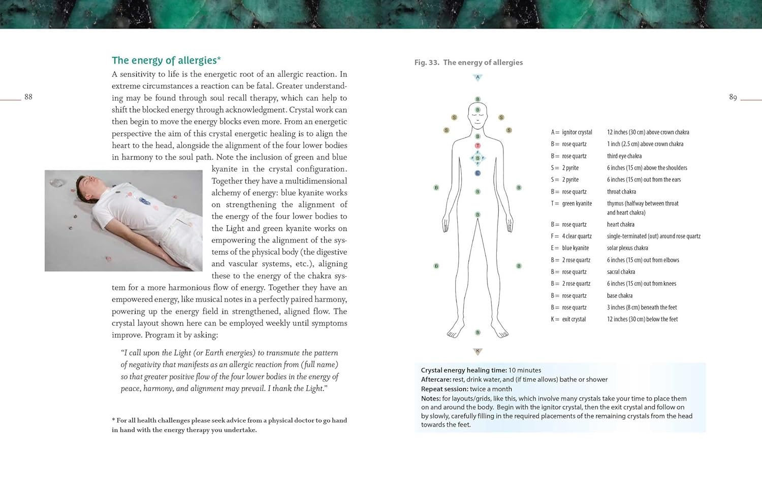 The author presents crystal body layouts for general energetic enhancement as well as for conditions and diseases for the skeletal structure, the heart and vascular system, the digestive system, the immune system, skin and hair, and the head. She explores the metaphysical origins of each ailment, which crystals to use, how to program them for targeted energy channeling, and how to arrange them on the body. In addition to physical ailments, the author also includes four gemstone body grids to attract peace, vitality, wisdom, and abundance.