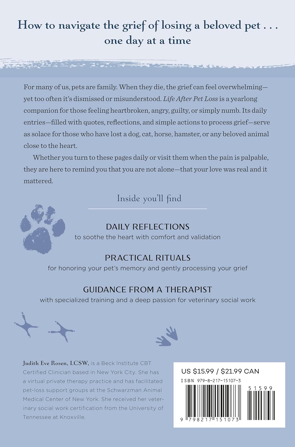 Written by a licensed psychotherapist with a specialty in veterinary social work, this deeply empathetic pet loss guide brings together practical insight and heartfelt compassion. Its year of daily reflections applies to the loss of a dog, cat, or any animal, with attention to the reality that grief is unique for each person and can change from moment to moment. Whether your grief is fresh or long-standing, these entries meet you where you are, guiding you through sorrow and remembrance with comfort, validation, and the space to grieve without judgment or a timeline. Inside you’ll find: