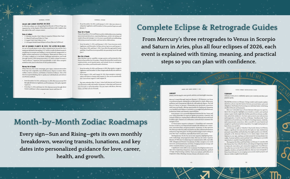 The book includes a link and QR code for a free download of the Cosmic Navigator 2026 Calendar with all the critical astrological dates and their meaning – from eclipses to retrogrades, significant transits, and planetary aspects, so that you can be better prepared for the turbulent year ahead.