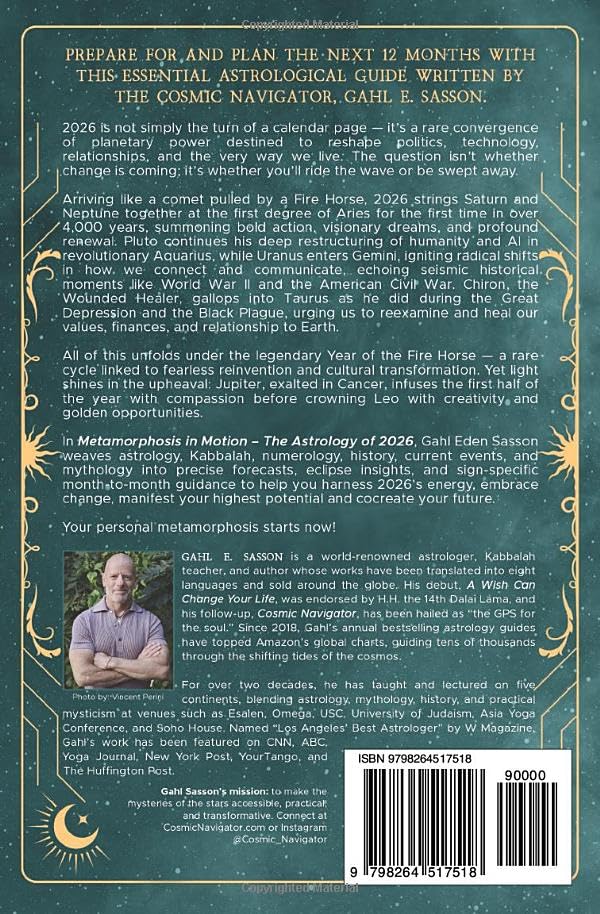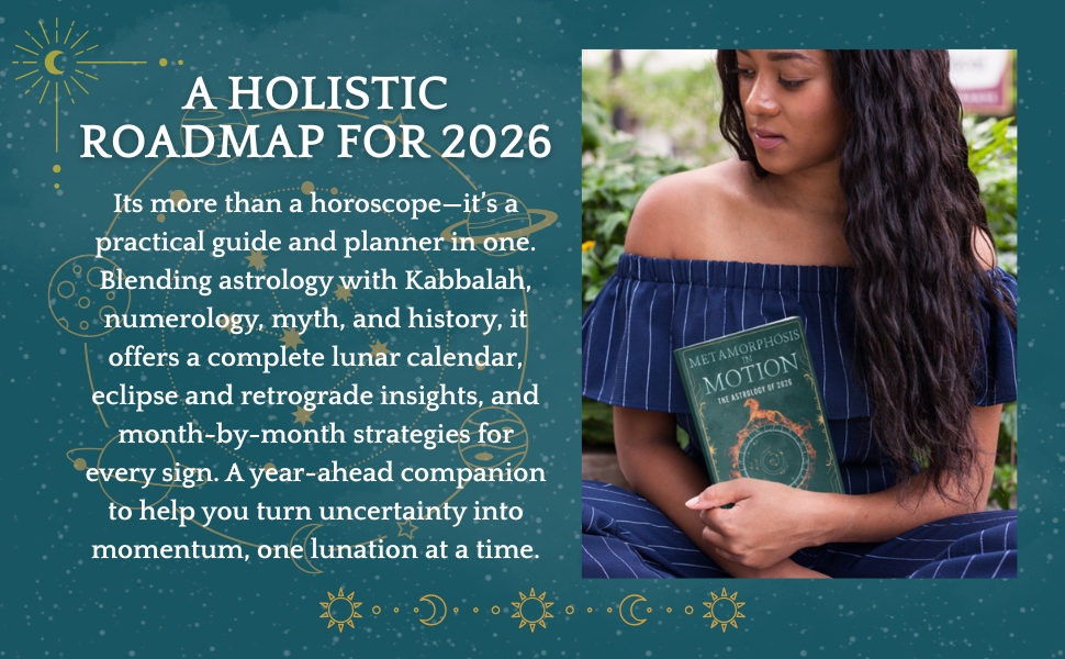Metamorphosis in Motion: The Astrology of 2026 is your practical year-ahead roadmap—part horoscope guide, part planner workbook. Inside, you’ll find a complete lunar calendar (new/full moons, four eclipse dates, timing for intentions), clear Mercury-retrograde guidance, and month-by-month strategies for every sign. The method blends Astrology with Kabbalah, Numerology, myth, and history to turn uncertainty into momentum—one lunation at a time. Read for your Sun and your Rising sign to personalize the forecast.