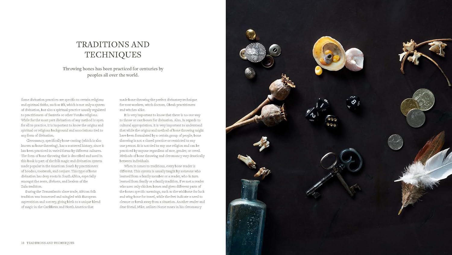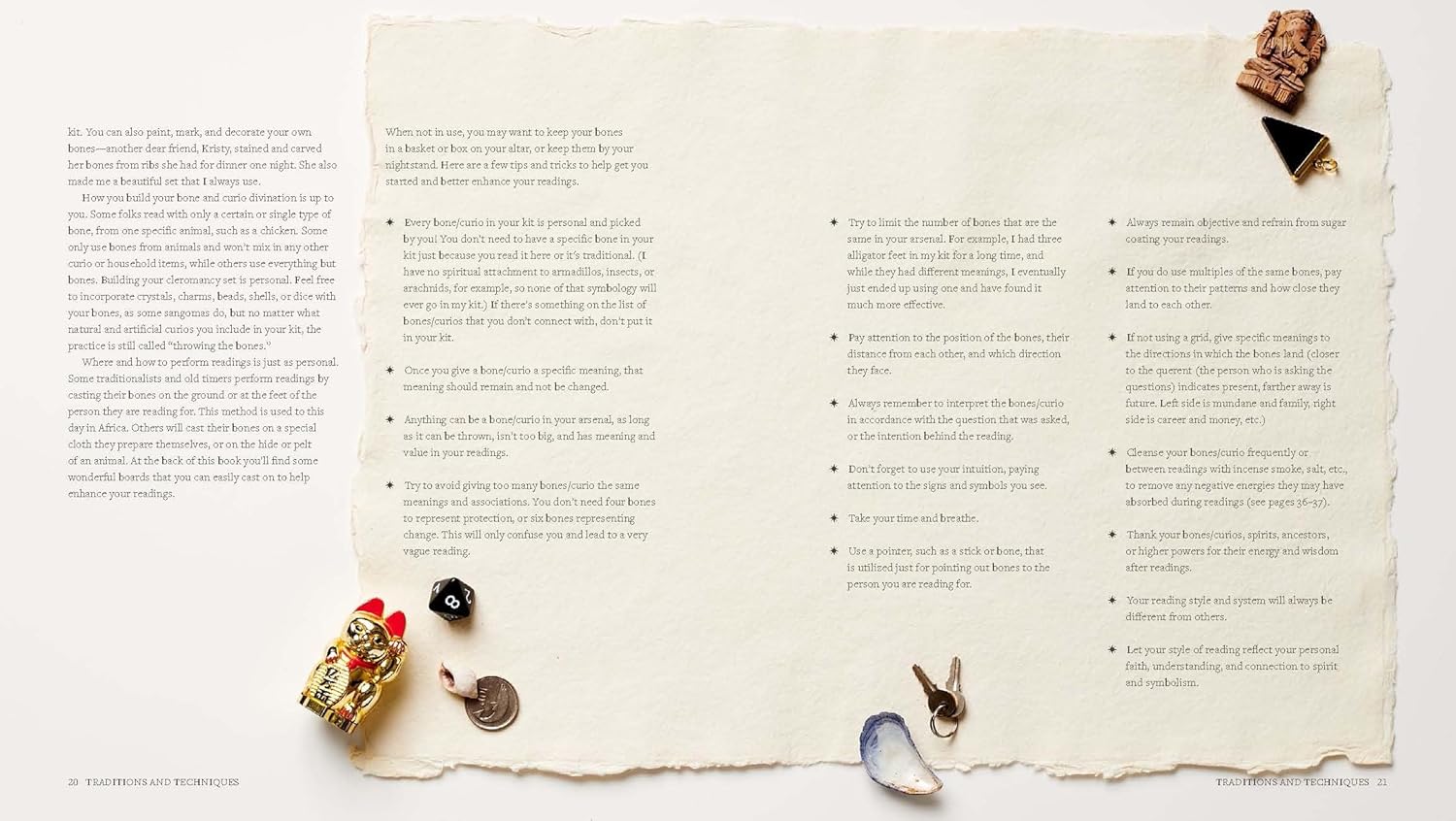 Fortune casting, or throwing bones and other objects for divination, is an age-old magical practice. “Bones” are like totems and can be any item: something from nature, like shells, roots, or crystals, or trinkets and found objects, like dice, coins, or keys. Whatever you use, casting will help you create a definitive divination system based on your personal practice. It is through casting that you can truly enhance your intuition and connect to the spiritual, earthly, and supernatural realms. Through collecting your objects, you are building a unique alphabet and language that will help you answer important questions.