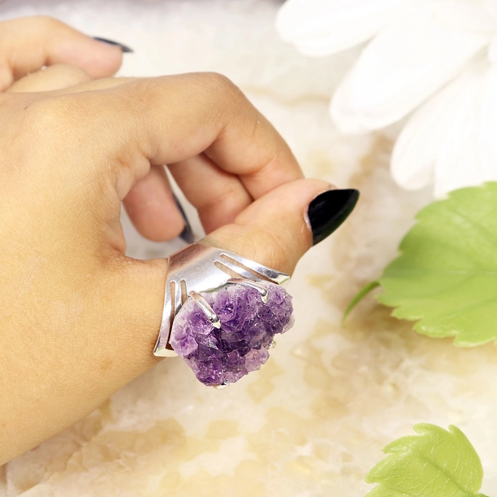 Amethyst, a powerful and protective crystal, is regarded as a natural tranquilizer as it relieves stress, alleviates sadness, and dispels negativity. Our Amethyst Cluster Adjustable Ring is perfect to be worn at all times as Amethyst balances mood swings, dissipates anger, rage, fear, and anxiety. It calms and stimulates the mind, and helps improve focus and motivation, making it ideal to wear during meditation and energy healing sessions. Activates spiritual awareness, opens intuition, and enhances psychic abilities of the wearer.