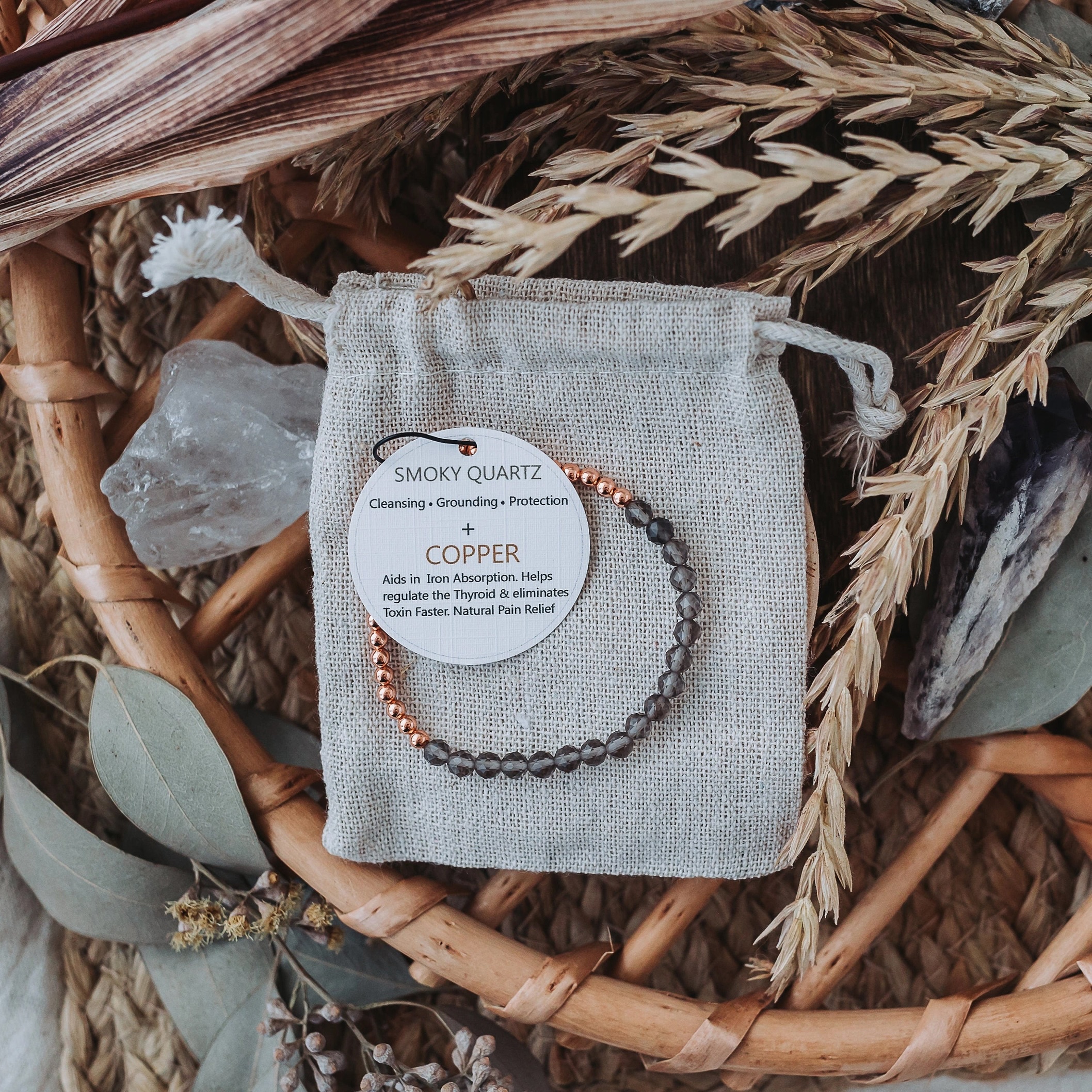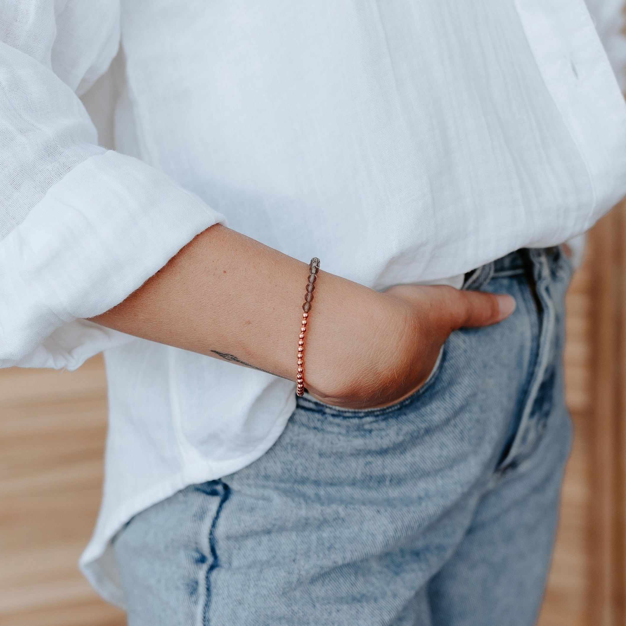 Dainty and minimal stretchy bracelet with multi-faceted 4mm Smoky Quartz + 3mm solid copper beads