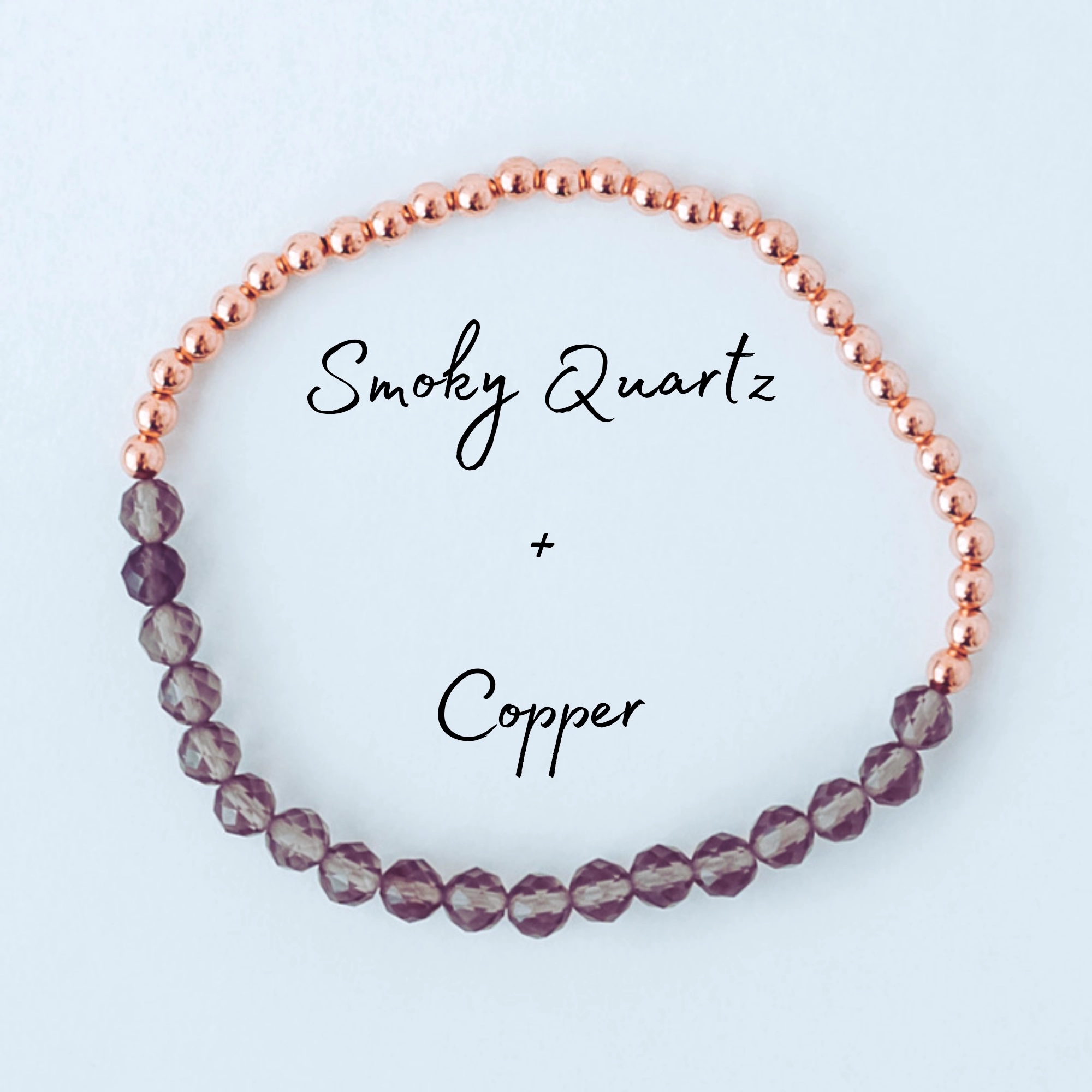 Dainty and minimal stretchy bracelet with multi-faceted 4mm Smoky Quartz + 3mm solid copper beads