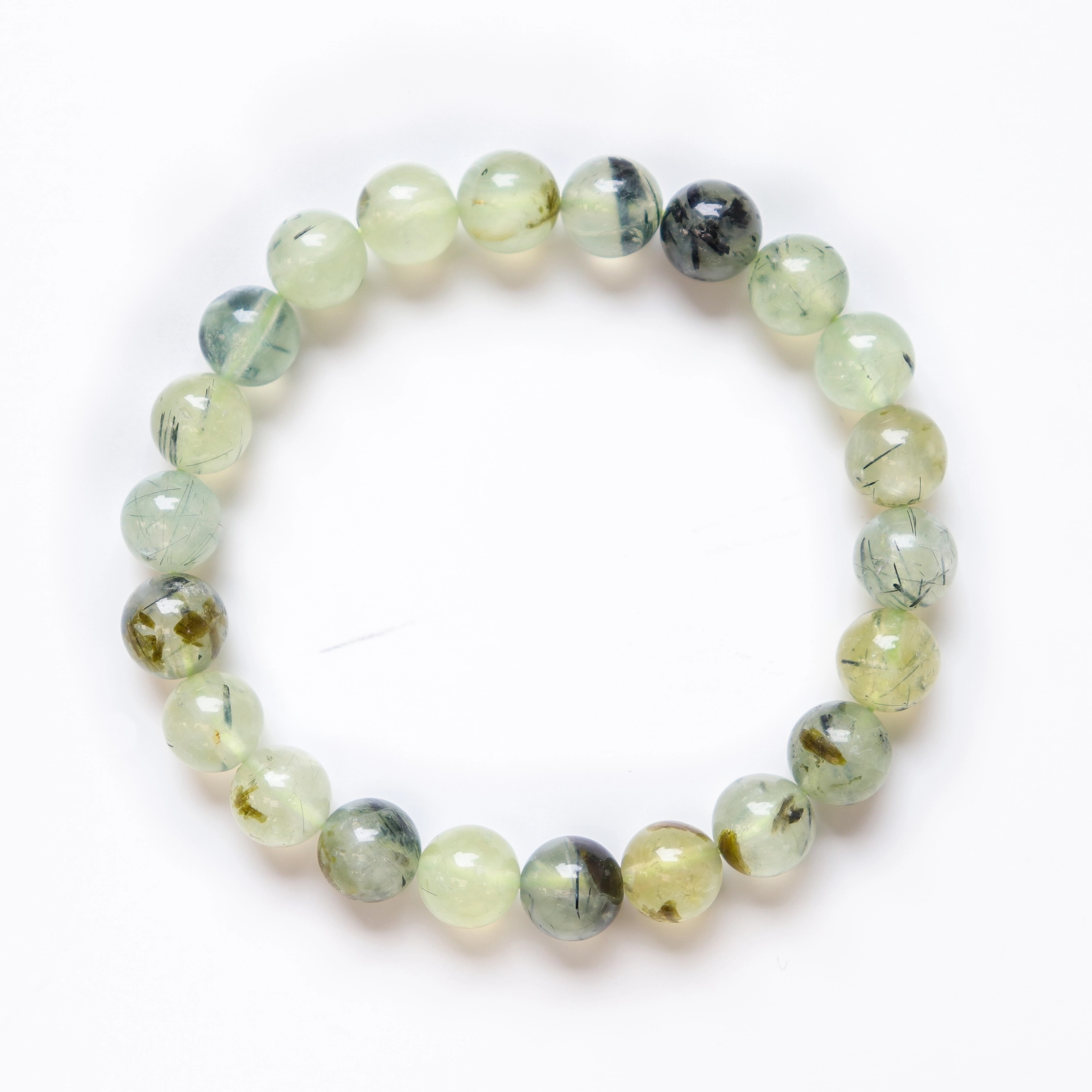 A unique blend of energies with our Epidote in Prehnite with Black Tourmaline Round Beaded Bracelet, featuring 8mm beads that combine the nurturing green of Prehnite, the grounding force of Black Tourmaline, and the transformative power of Epidote.