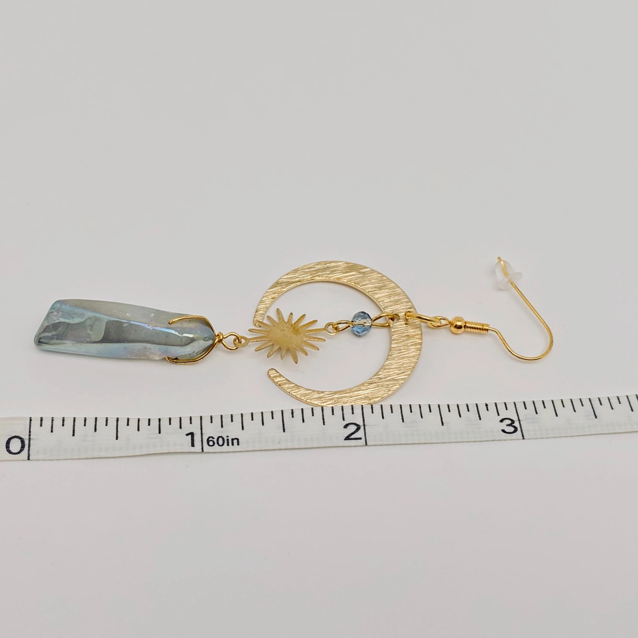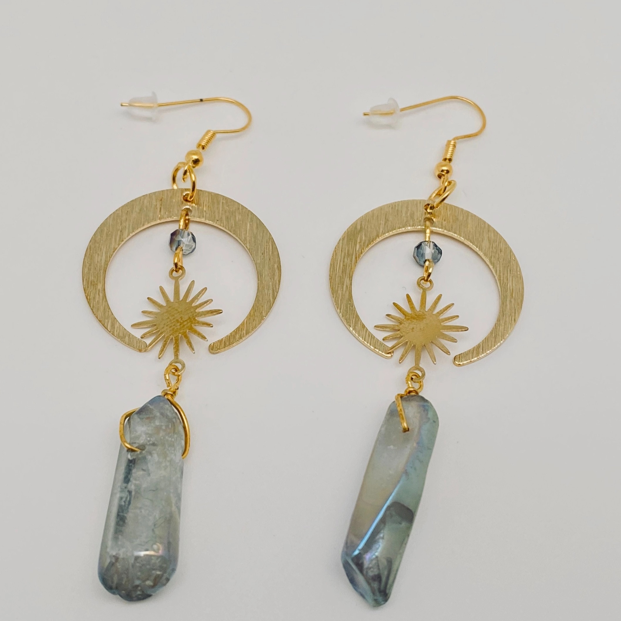 Celestial and softly luminous, these earrings blend cosmic symbolism with natural crystal beauty. A brushed gold crescent frames a radiant starburst, suspended above elongated gray treated quartz points that catch the light with subtle flashes of blue and smoke-toned shimmer.