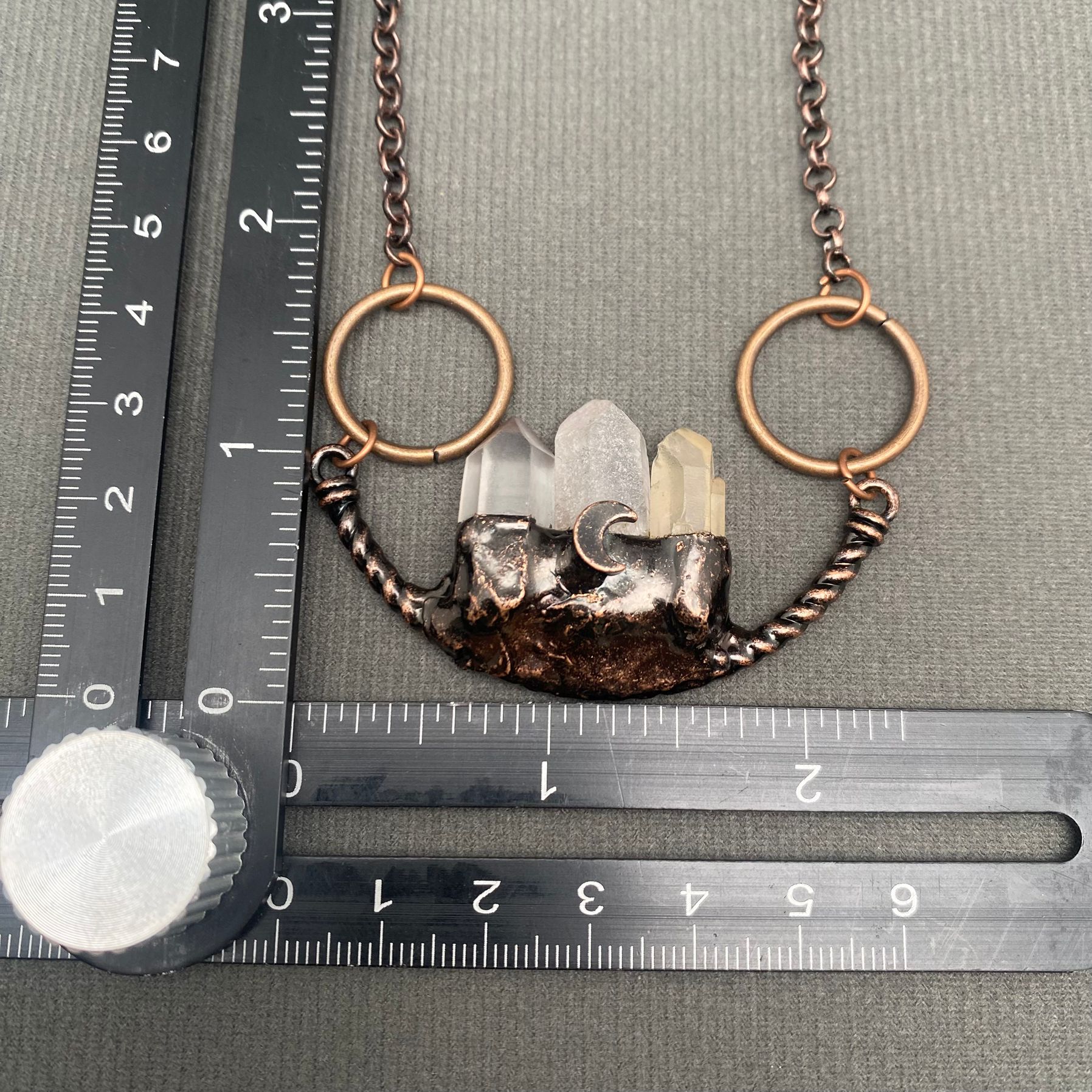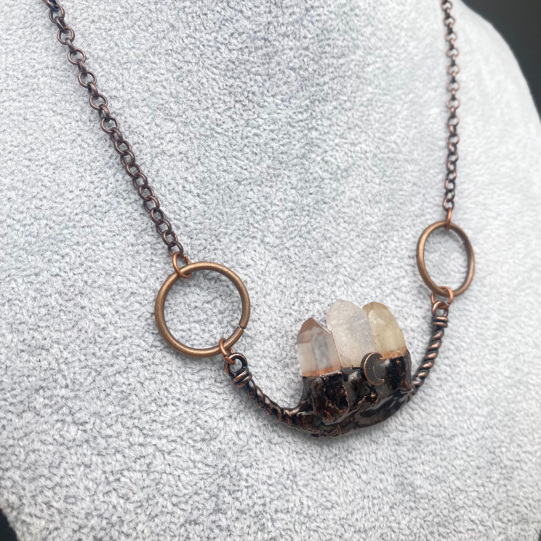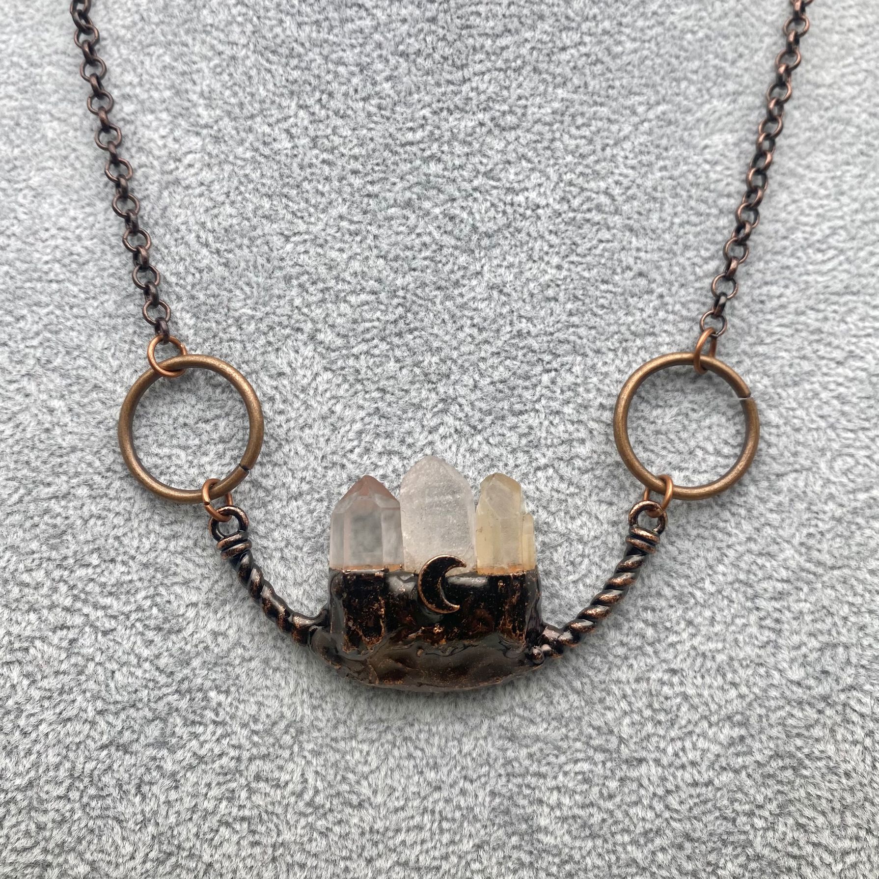 The crescent moon detail adds a subtle celestial touch, symbolizing intuition, cycles, and transformation. Finished with antique-style copper rings and chain, this necklace blends rustic elegance with mystical energy—perfect for everyday wear or ritual adornment.
