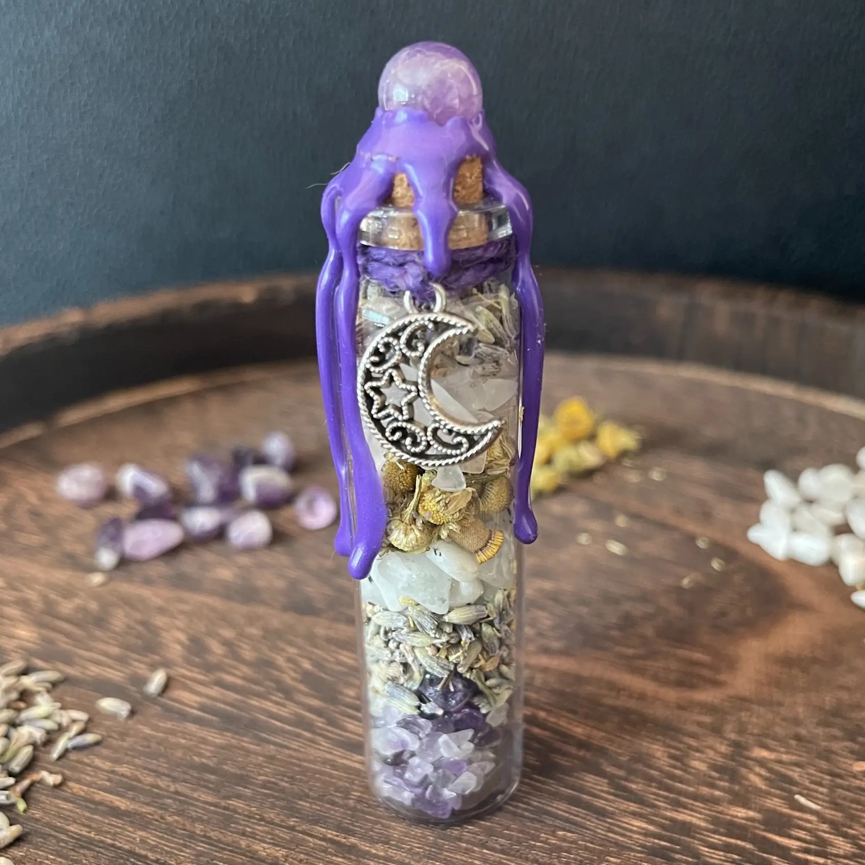 Topped with a mini amethyst sphere and a delicate moon charm, then sealed with purple wax, this piece beautifully symbolizes intuition, rest, and spiritual harmony.