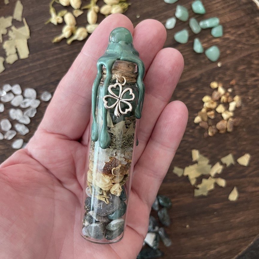 It is topped with a green aventurine mini sphere, a clover charm, and sealed with green wax.