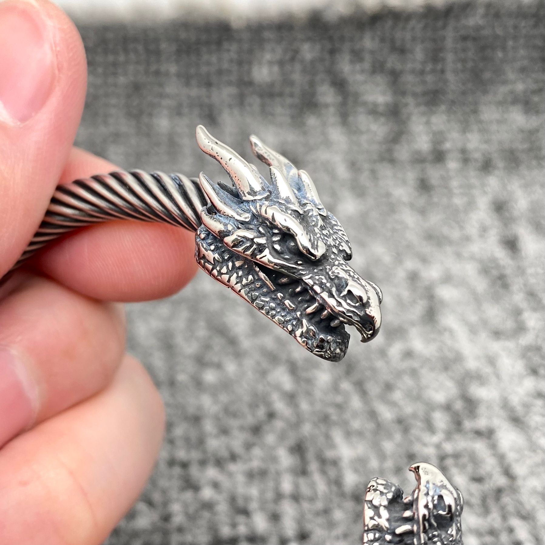 Bold, powerful, and unmistakably fierce, this bracelet is a statement piece built for strength and style. Featuring two highly detailed dragon heads facing one another, the twisted cable-style cuff adds a sense of motion and intensity that feels both ancient and modern.