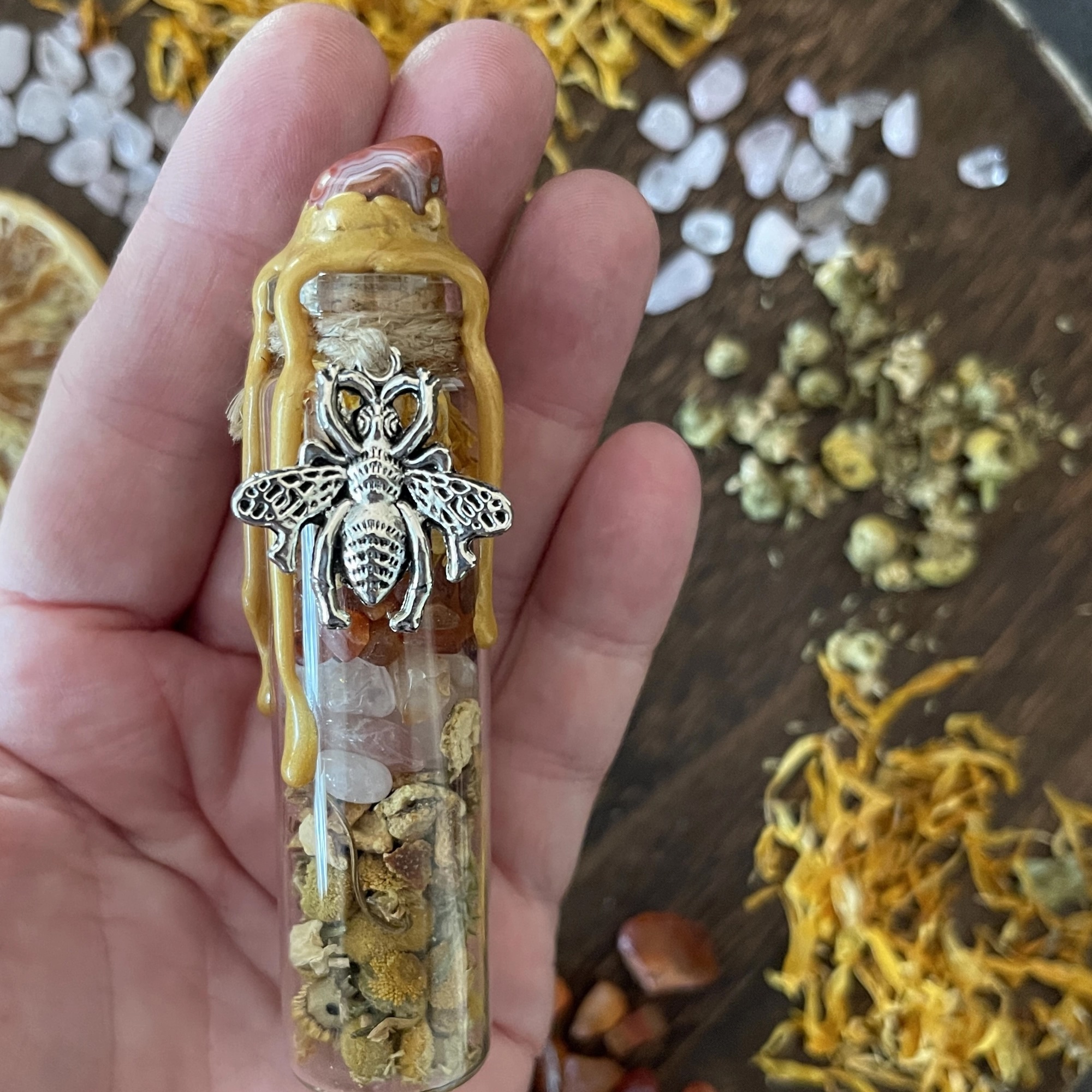Topped with a carnelian chip and an adorable bee charm—symbolizing community, sweetness, and abundance—and sealed with gold wax, this jar radiates sunshine energy in every detail.