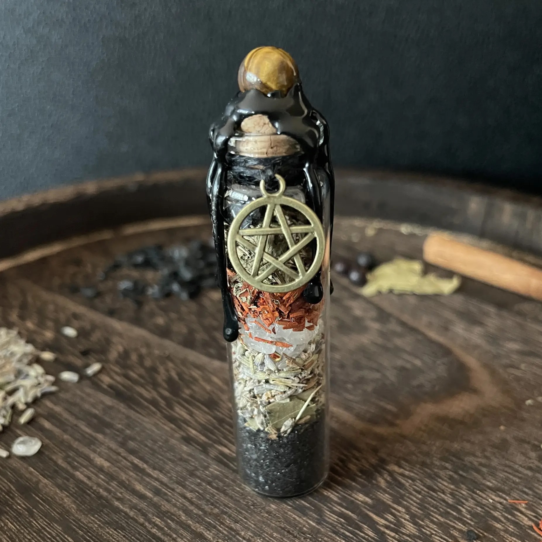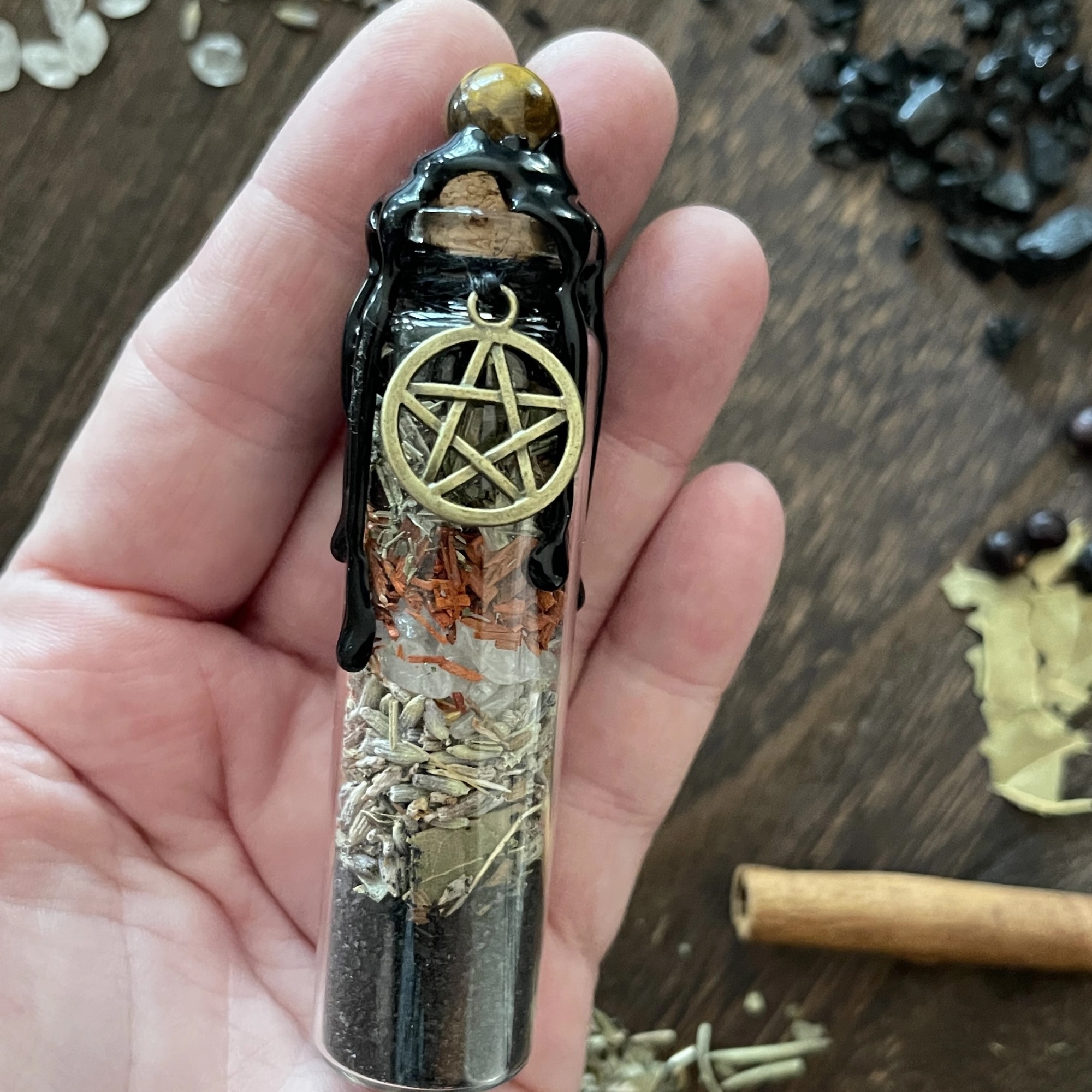 It is topped with a tiger's eye mini sphere, a pentacle charm, and sealed with black wax.