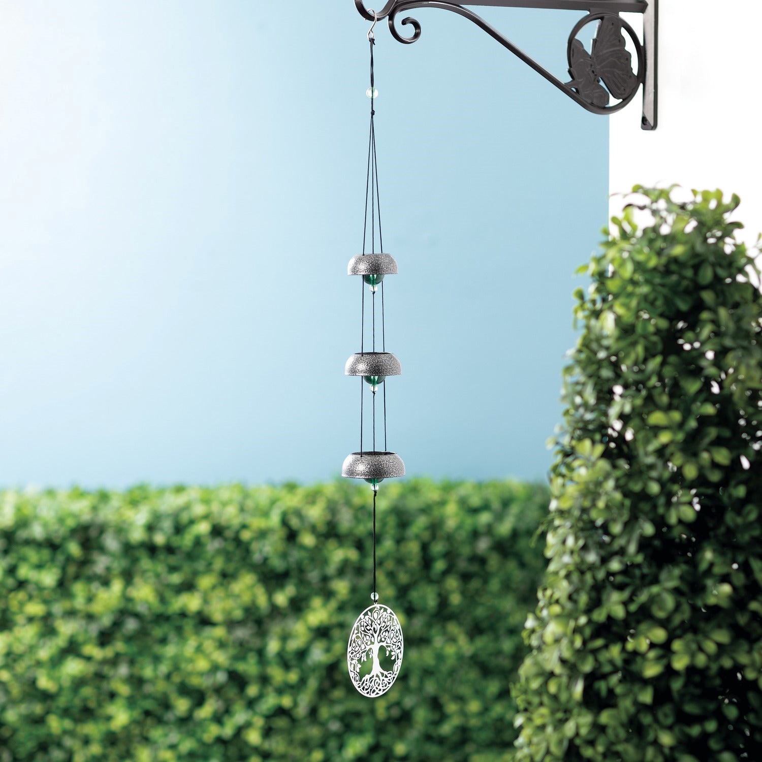 These bells feature green crystal accents and a silver laser-cut Tree of Life windcatcher. The Tree of Life is recognized in many mythological, religious, and philosophical traditions. It symbolizes a connection between the earth and the heavens.