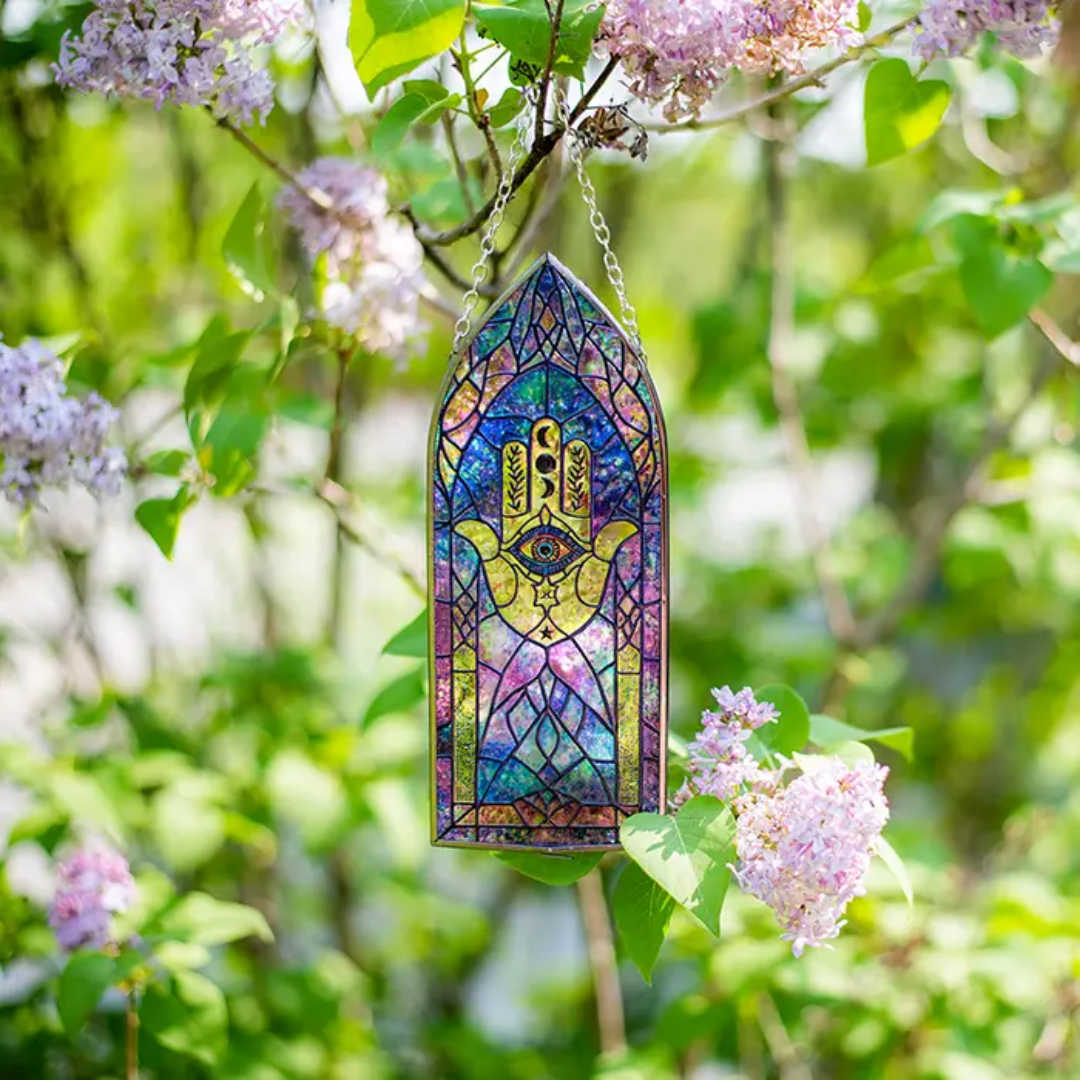 This stunning glass suncatcher features the Hamsa Hand, a timeless symbol of protection, strength, and divine guidance. The all-seeing eye at its center adds a layer of spiritual insight and awareness. Perfect for those seeking a meaningful and elegant piece, it brings a sense of peace, positivity, and sacred energy to your space.