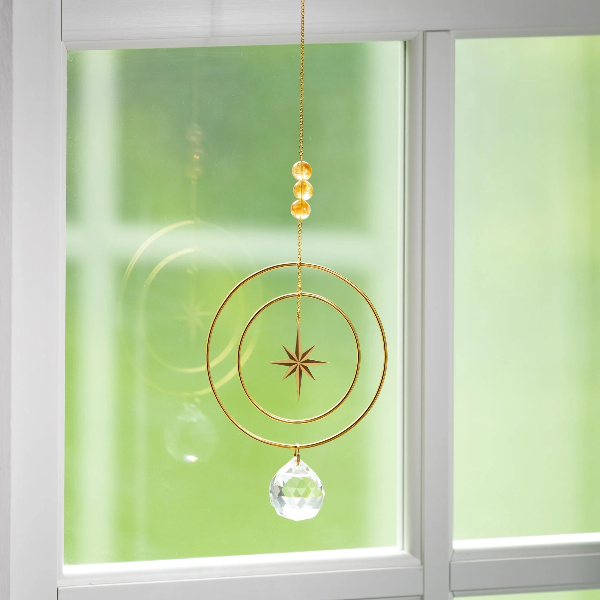 At its center, a striking eight-pointed star hangs elegantly within concentric gold-tone rings, embodying celestial charm and timeless elegance. A faceted crystal prism dangles below, catching sunlight to scatter vibrant rainbows across your room. The suncatcher is accented with three golden stone beads, suspended along a delicate gold chain. Perfect for brightening windows, enhancing sacred spaces, or as a thoughtful gift, this piece brings a touch of cosmic wonder and uplifting energy to any setting.