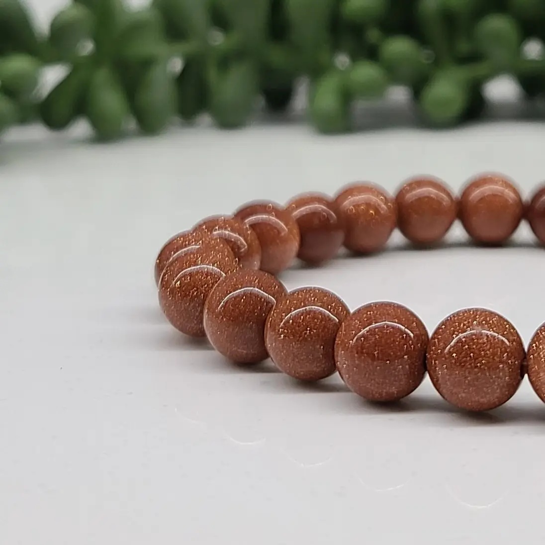 This beautiful Goldstone bracelet shimmers with thousands of tiny copper sparkles, giving the beads a warm, glowing appearance that catches the light with every movement.