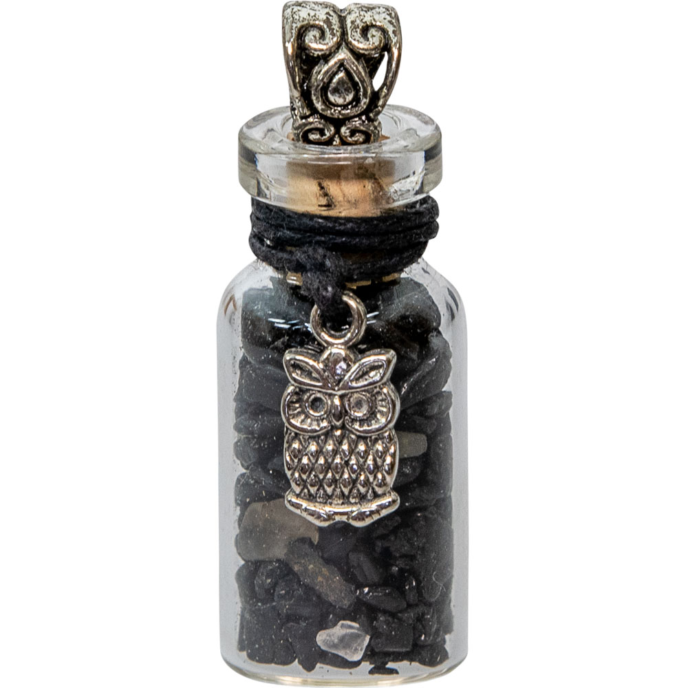 The miniature bottles are sealed with a decorative cap and suspended from a cord, creating a unique piece of jewelry that blends natural crystal energy with spiritual symbolism.