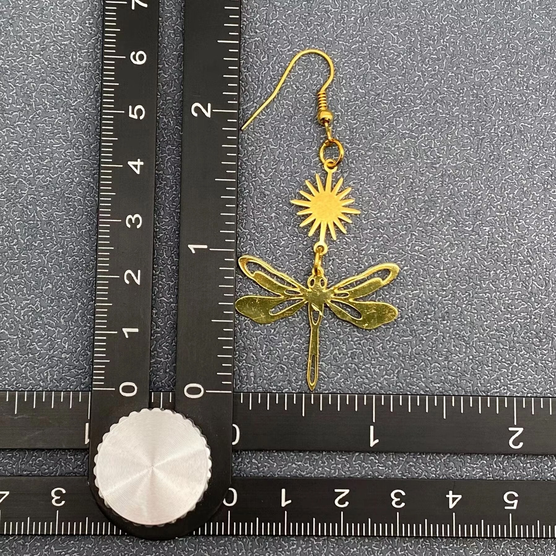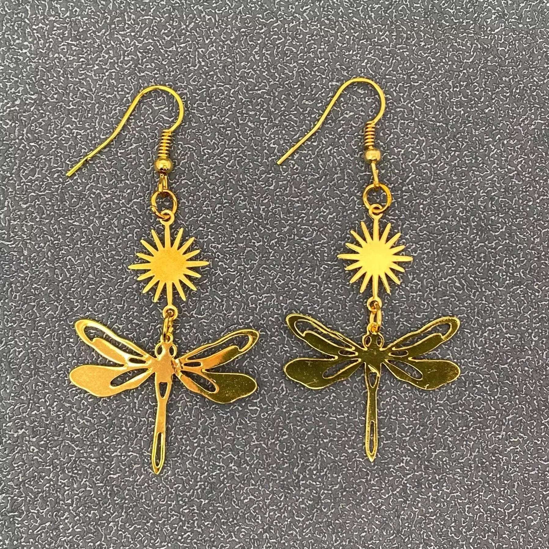 Light, luminous, and full of symbolism, these earrings pair a radiant starburst with a delicate dragonfly silhouette. The polished gold-tone finish catches the light beautifully, creating subtle movement and shimmer with every turn of the head.