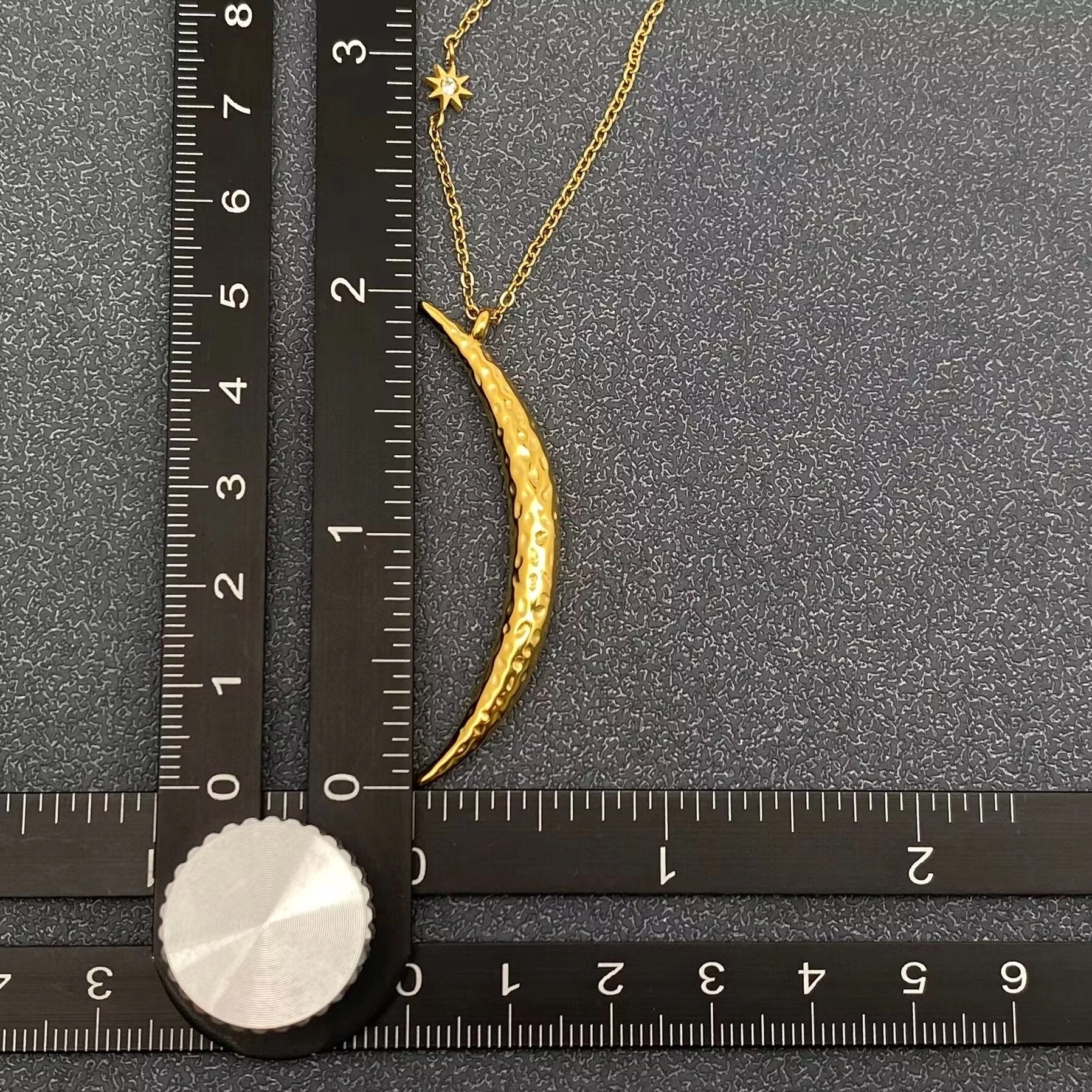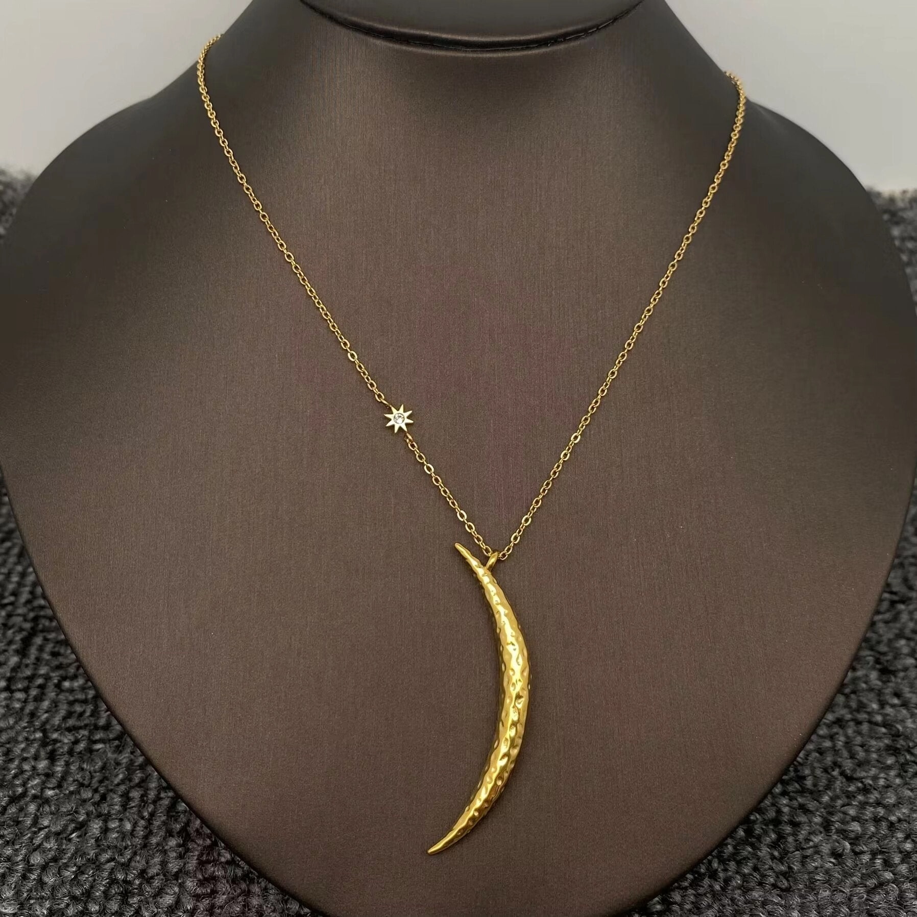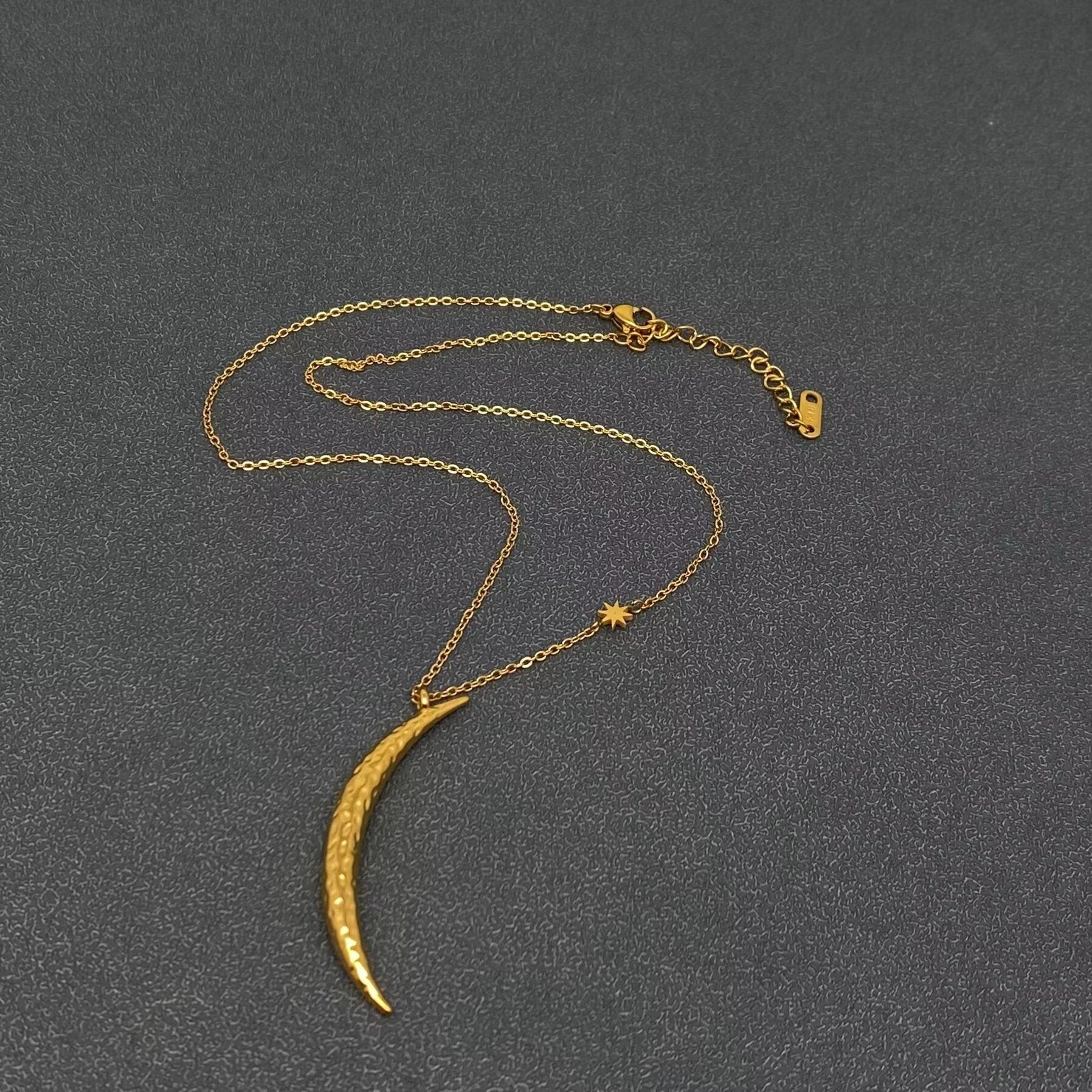 Designed with a sleek, elongated crescent and finished in radiant gold tone, it’s perfect for everyday wear or layered with your favorite pieces for a modern, mystical statement. Crafted from high-quality stainless steel and finished with 18K gold vacuum electroplating, this necklace is made to last—resistant to tarnish, gentle on skin, and polished to a brilliant shine. Lightweight yet eye-catching, it moves effortlessly from casual days to intentional evenings.