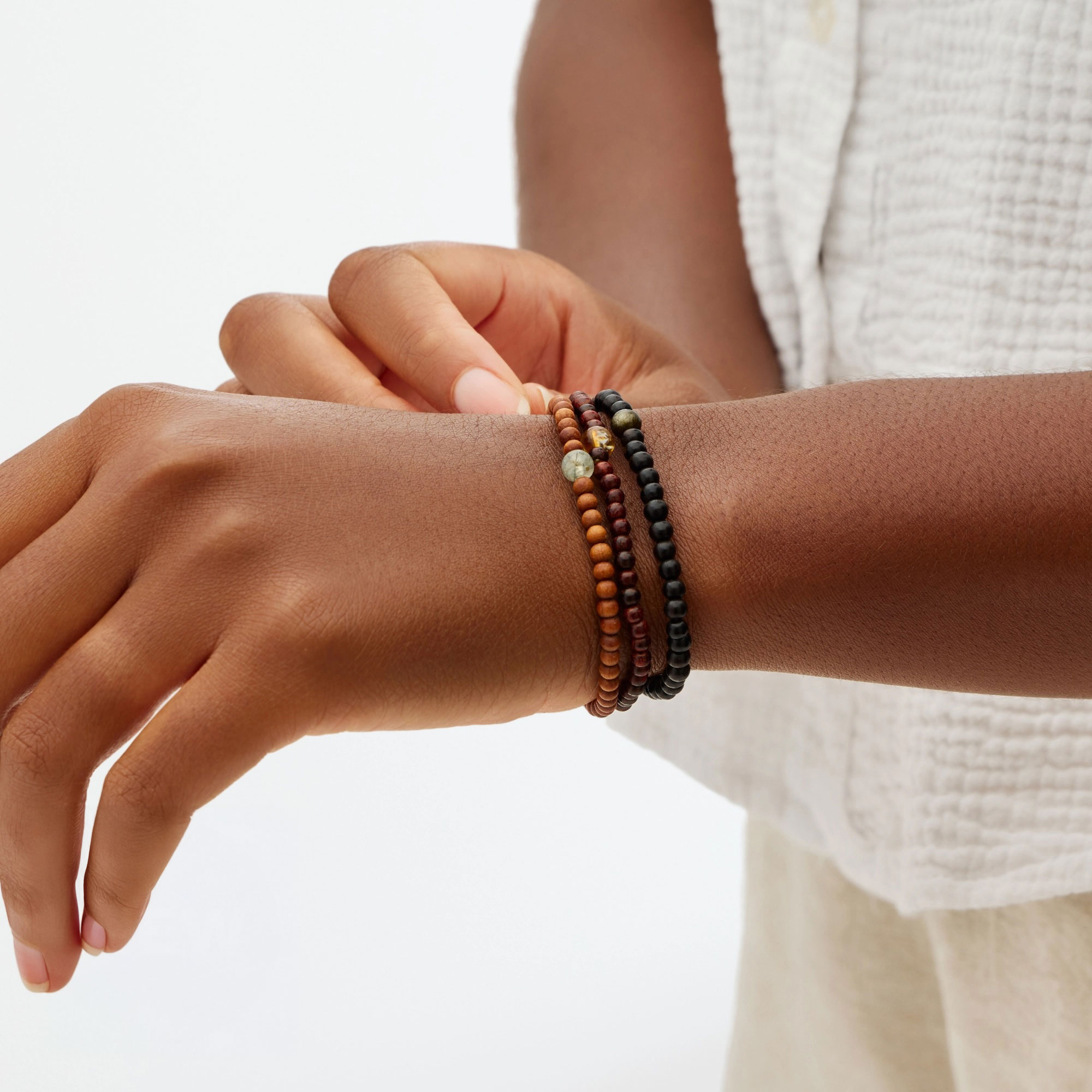 Each piece features sustainably sourced 4mm wood beads paired with 6mm crystal accents, creating a balanced combination of earthy warmth and energetic clarity. Inspired by traditional mala beads used in meditation, these bracelets are perfect for setting intentions, staying centered, and cultivating inner harmony throughout the day.