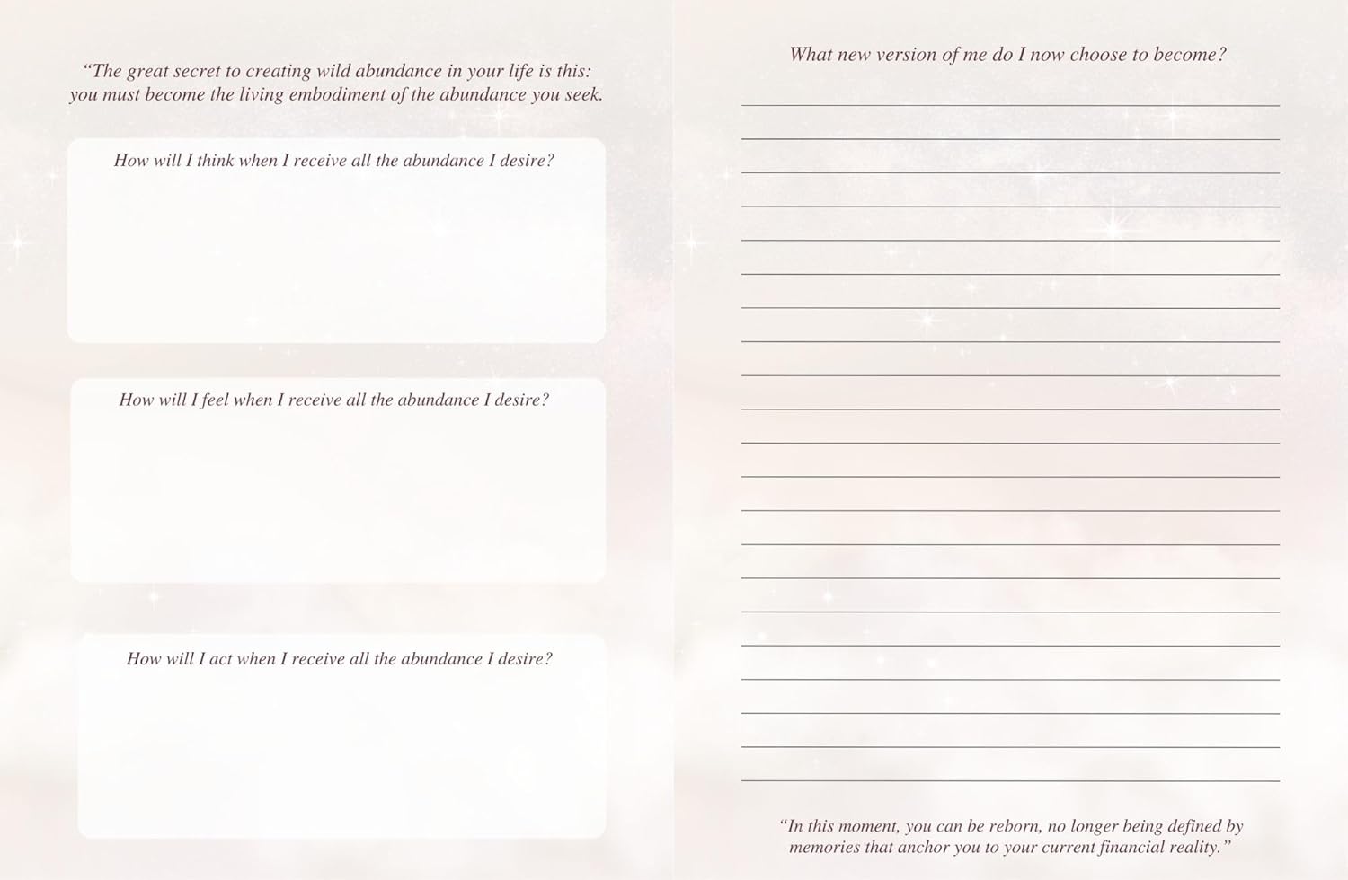 The Way of the Wealthy Woman Journal is more than a journal—it's an immersive portal into the world of abundance and prosperity. The visuals serve as gateways to a deeper understanding of abundance and one's power to manifest it. Woven seamlessly into this journal are transformative affirmations, pearls of wisdom, and guided reflections, each curated to activate the energy of wealth. Engaging with this journal is more than a passive act of reading; it's an invitation to align with the frequency of prosperity, ensuring that readers not only dream of abundance but actively call it into their lives.