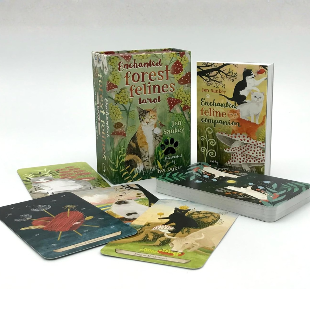 Nature's magick flits through dappled oaks, and feline oracles bound from tree to tree. In the Enchanted Forest, you'll think clearly and see situations anew. The court cards in this Rider-Waite-Smith-style deck are ruled by Bombay (king), Egyptian Mau (queen), Himalayan (knight), and Munchkin (page) cats. The four suits are transformed into dandelions (swords), saucers (cups), branches (wands), and mushrooms (pentacles). Through Iva Dukic's irresistible illustrations and Jen Sankey's insightful guidebook, the cats will help you recognize your true self and intrinsic nature.