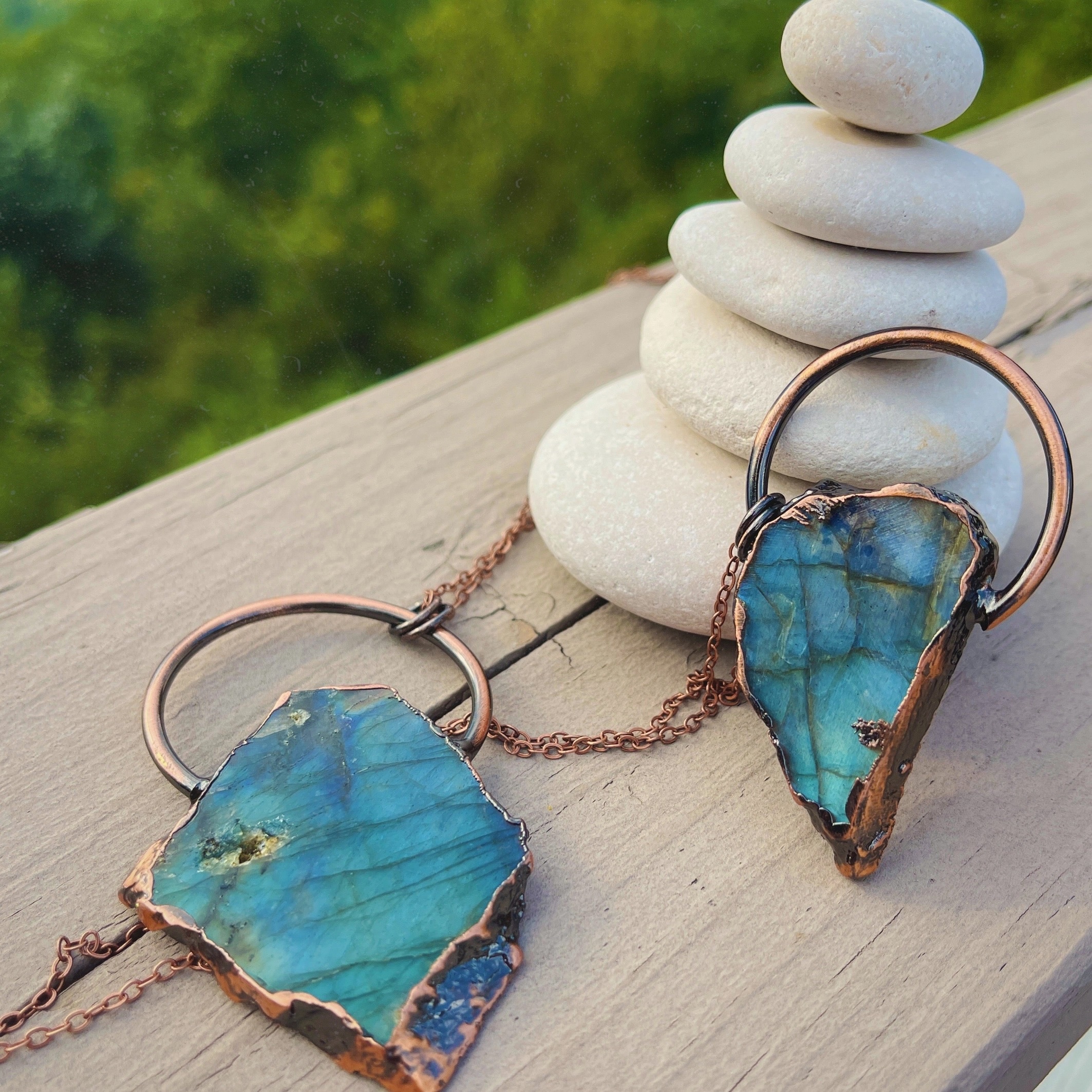 Just wow! Each necklace is handmade in vintage copper around a unique slice of Labradorite. Each natural stone vibrates with positive, healing, calming and transformational energy.