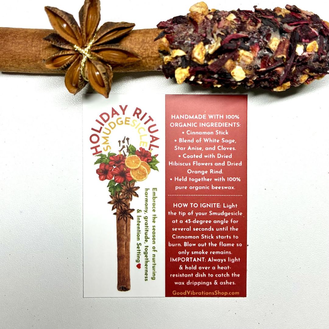 Our Holiday Ritual Smudgesicle is a fragrant blend designed to enhance the entire holiday season from Thanksgiving straight through to New Year's. Infused with the warm and inviting aromas of organic Cinnamon Stick, White Sage, Cloves, Orange Peel, Star Anise, and Hibiscus, this unique product beautifully captures the essence of the Holidays while offering profound spiritual benefits.