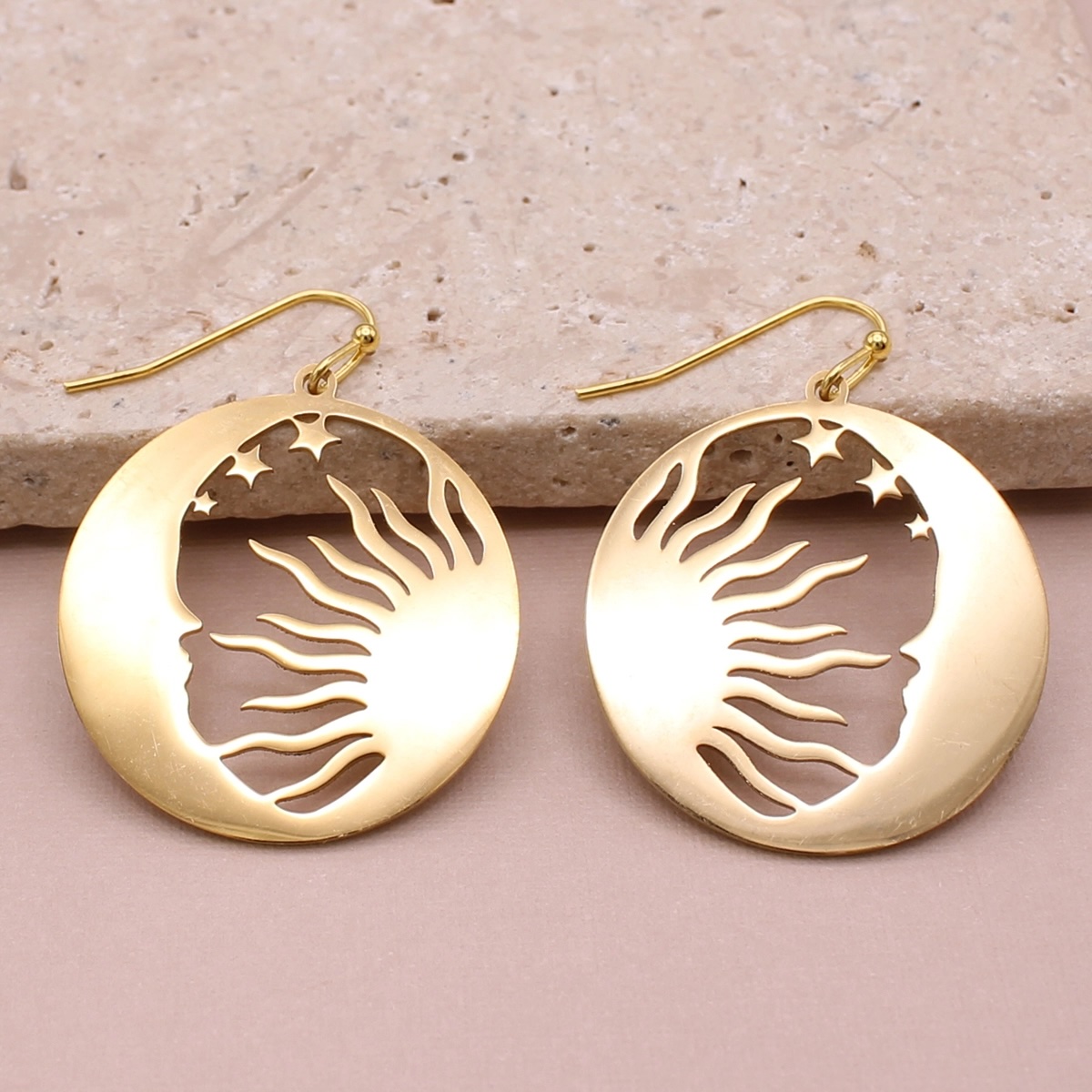 A captivating blend of celestial beauty combines to create these laser-cut crescent moon and sun earrings. These heavenly earrings feature a round design with laser-cut details of a crescent moon and a radiant sun. The celestial symbols symbolize balance and vitality.