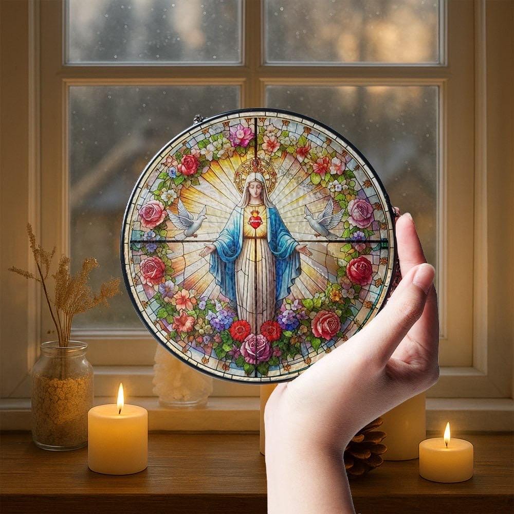 Bring peace, grace, and heavenly beauty into your home with this exquisite Virgin Mary Suncatcher, inspired by the timeless look of traditional stained glass windows. Featuring the Blessed Mother with the radiant Sacred Heart, surrounded by lush roses, blooming florals, and gentle doves, this piece creates a serene and uplifting focal point wherever it’s displayed.