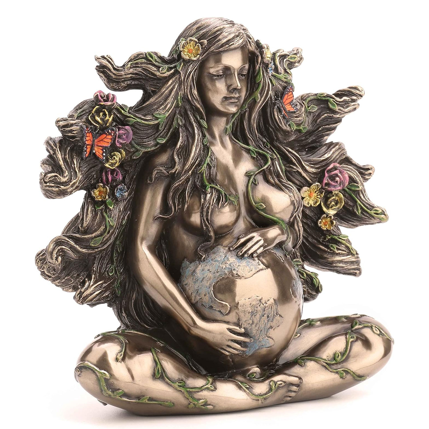 Shown in serene meditation while lovingly cradling a pregnant belly shaped as the planet, this sculpture beautifully symbolizes fertility, life, and the interconnectedness of all beings. Crafted from high-quality designer resin and finished with a cold cast bronze technique, this statue showcases remarkable detail—from Gaia’s flowing hair entwined with flowers and butterflies to the delicate vines that wrap gracefully around her body. Hand-painted accents by skilled artisans bring vibrant color and depth to the piece, enhancing its ethereal presence.