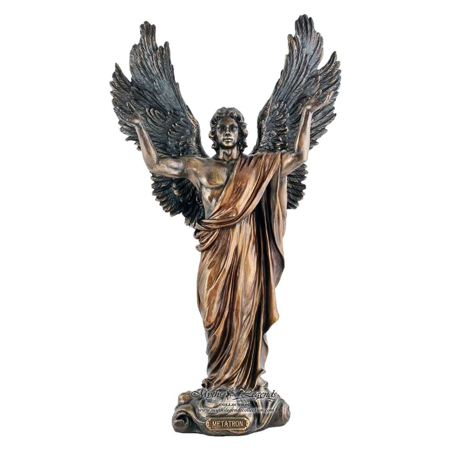 Standing at just over14.5 inches tall, Metatron is depicted with wings fully outstretched and arms lifted toward the heavens—a powerful representation of divine authority, spiritual guidance, and celestial connection. Every detail of this masterpiece is finely sculpted, from the flowing folds of his robe to the intricate feathering of his wings. The sturdy base ensures stability, making it perfect for display on altars, shelves, desks, or as a standout decorative centerpiece.