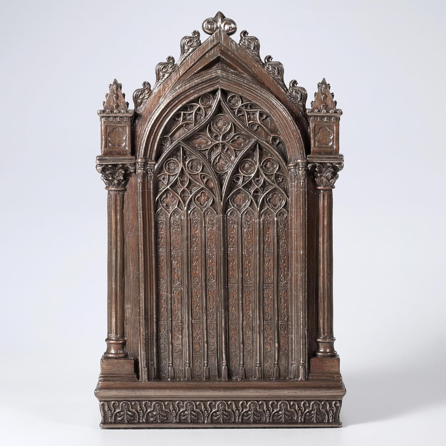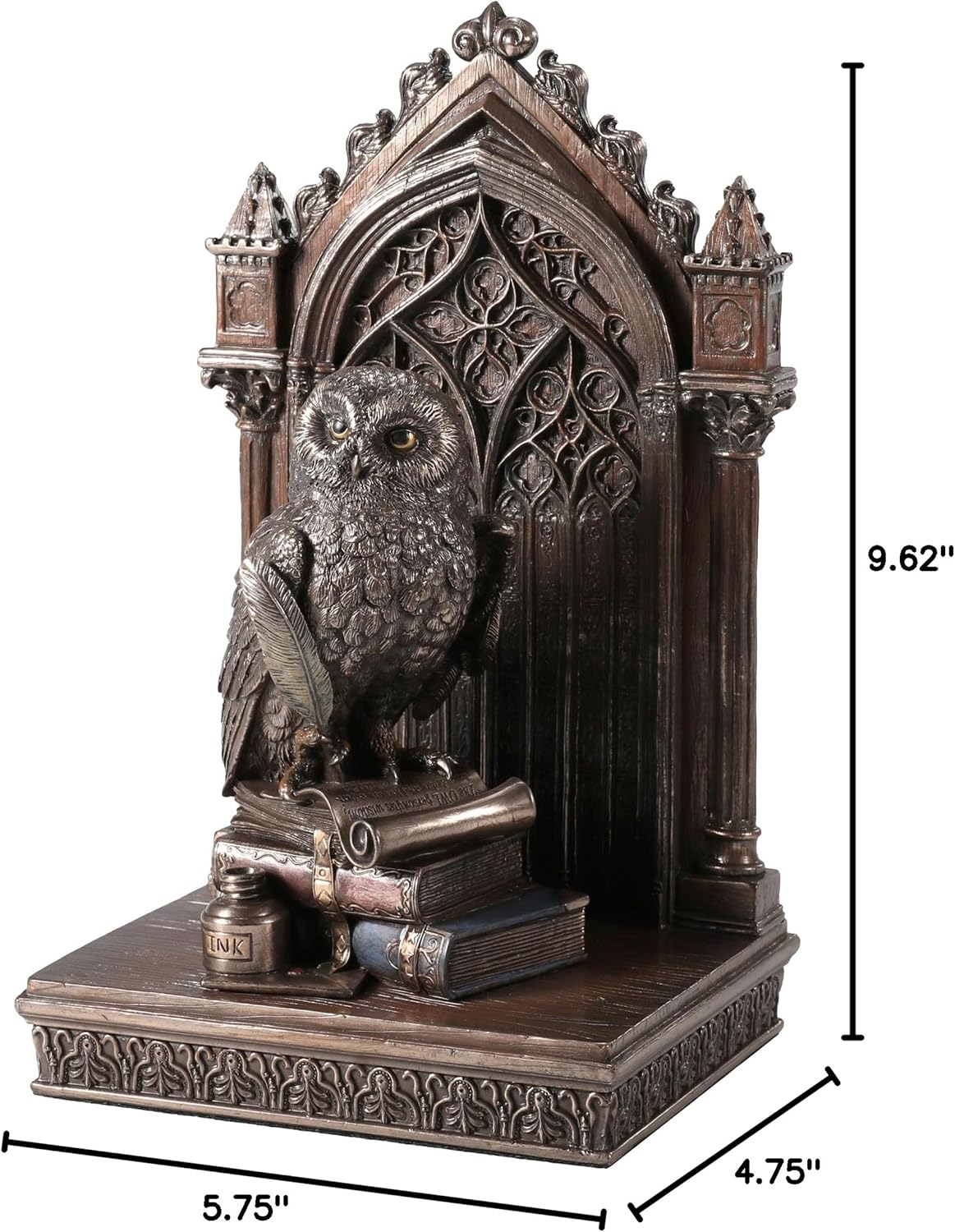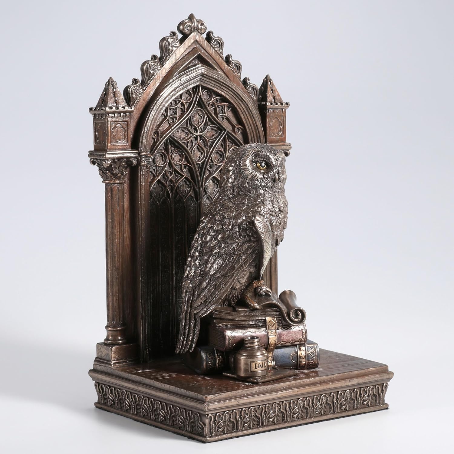 The owl—long revered as a symbol of knowledge, intuition, and scholarly insight—perches atop a stack of ornate books, complete with an ink pot and quill, all framed by an intricate Gothic archway. Every feather, flourish, and architectural carving is rendered with remarkable realism, creating a truly captivating centerpiece.