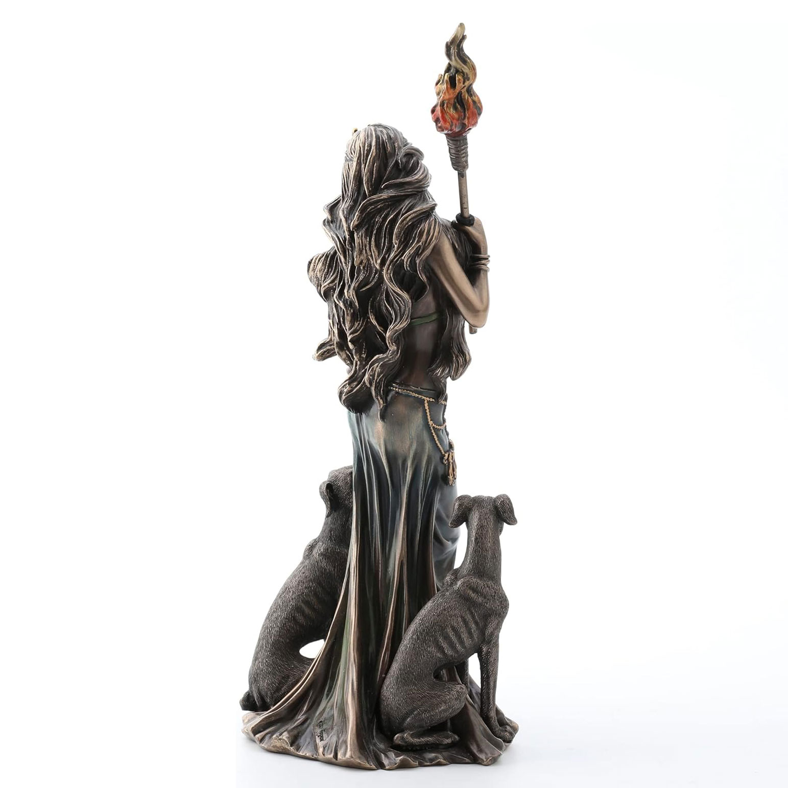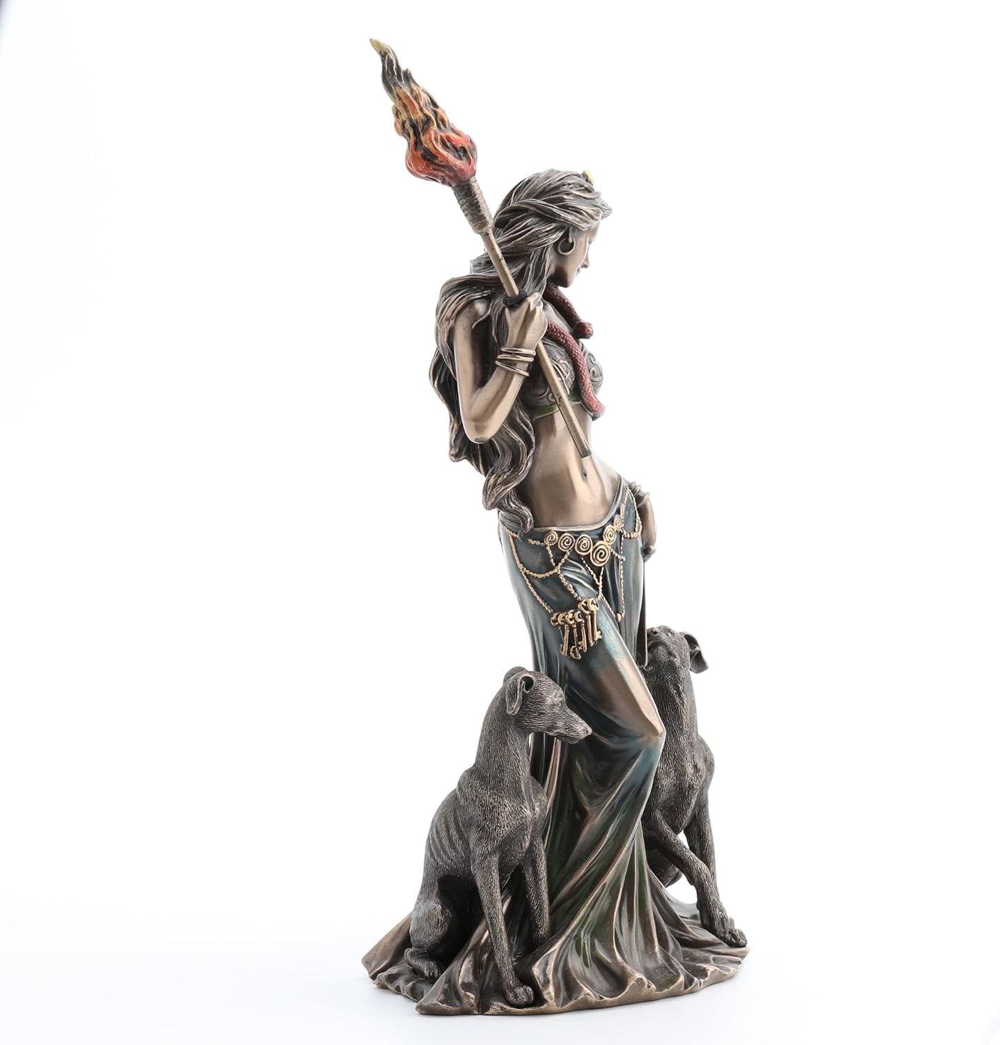 Standing over 13 inches tall, this intricately detailed sculpture depicts Hecate holding a flaming torch—a symbol of illumination and guidance—accompanied by her loyal hounds, guardians of the shadowed realms. A serpent coils gracefully around her form, echoing her deep connection to transformation and hidden wisdom.